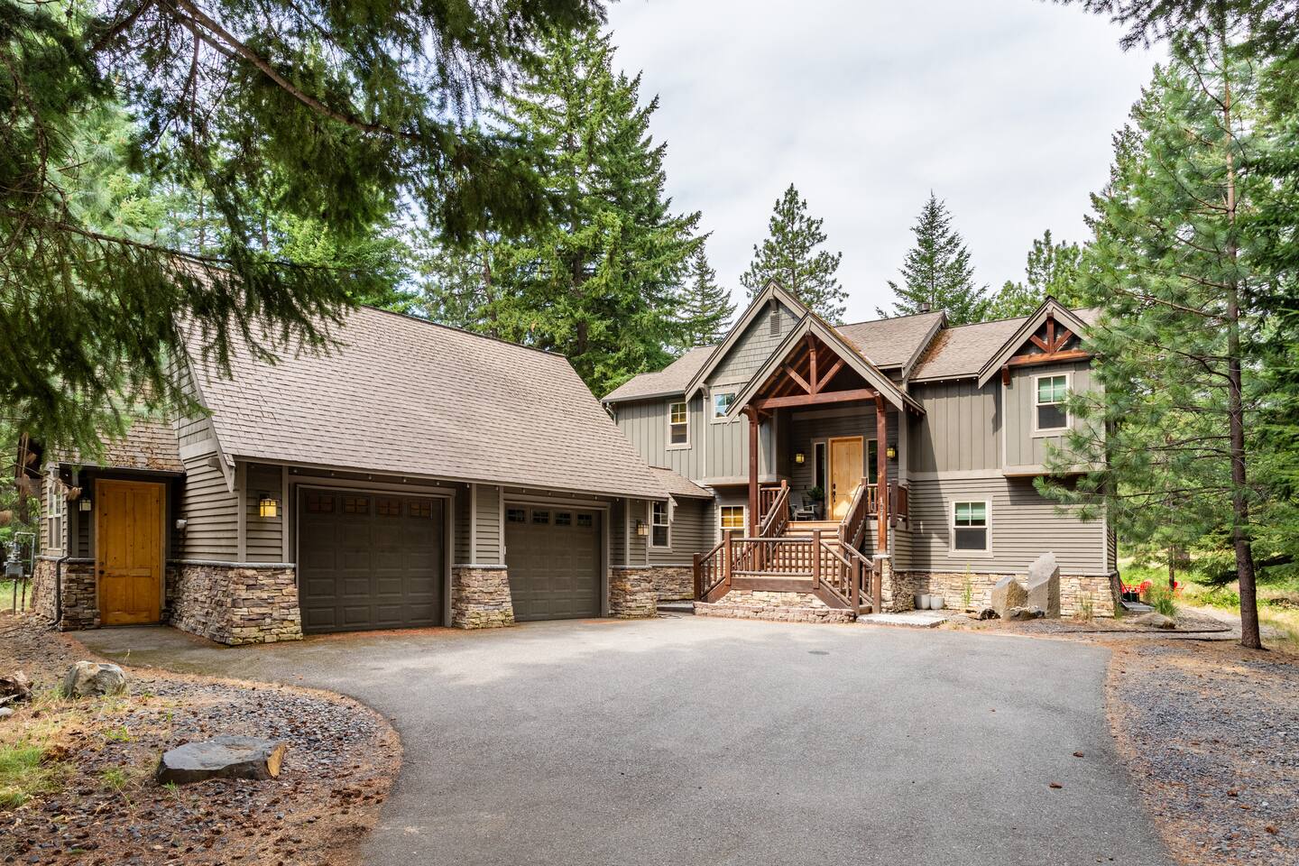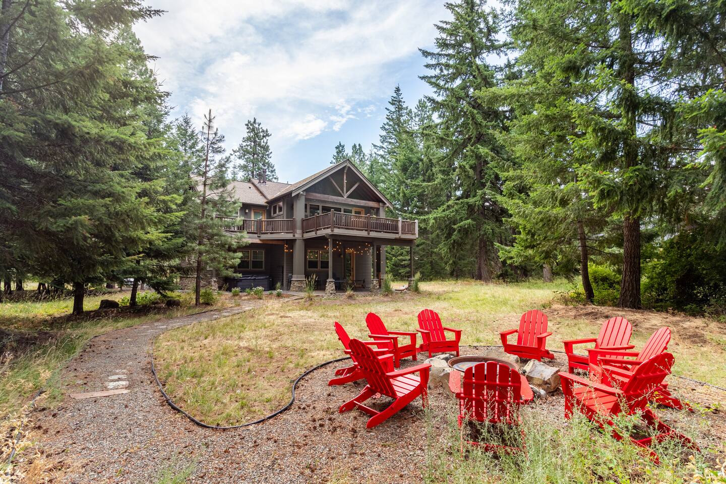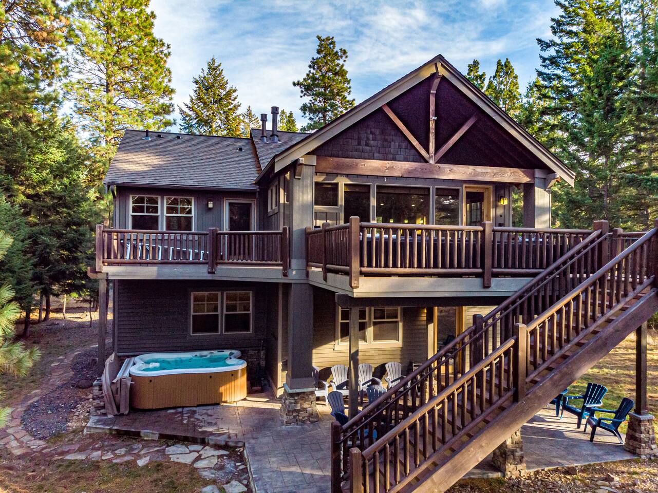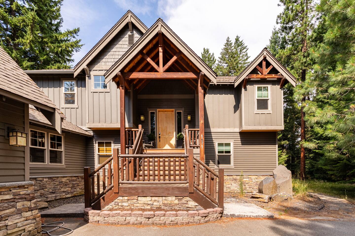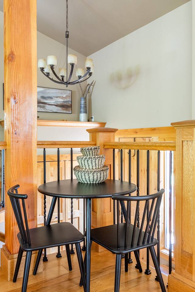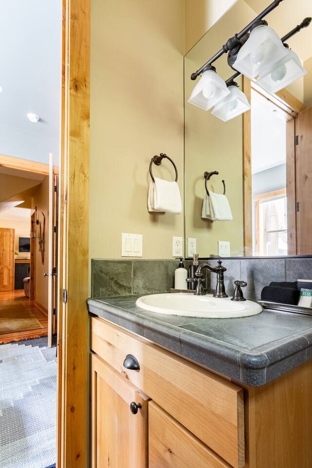 This stunning home offers the comfort, convenience, and privacy of a house with the luxury of a high-end hotel. We have carefully provided luxurious furnishings and amenities to make it one of the most desirable vacation homes at Suncadia! The home offers many amenities, including a full kitchen with professional-grade appliances, a large living room with a beautiful stone fireplace, a large patio and deck, toys and games for the whole family, 6 large HDTV's with DirectTV, apps, and FireTV's, and complimentary 100MB internet. Also we have just recently added a Golf Simulator for year round Golf. It’s all you could want for your next getaway! • Kitchen: the spacious kitchen features all the appliances, cookware, and utensils you need to prepare delicious meals—or you can cook outdoors on our gas barbeque. Enjoy your culinary creations at the spacious 10-seat dining room table, kitchen bar, or even outside on our 8-person patio set and enormous outdoor sectional. This home was built for entertaining! • Activities: there are many ways to spend a fun afternoon or evening around the property, from relaxing in the 8-person hot tub, to enjoying lawn games, to watching your favorite sports in the spacious living room on our 65” 4K curved TV. In the living room curl up with a book beside the stone fireplace, or enjoy the evening with a large group of family and friends. • Bedrooms: each of the 4 bedrooms are fully furnished for your group and uniquely designed with their own themes, and the bathrooms are stocked with complimentary essentials. The master bedroom offers a plush king-size bed, gas fireplace, TV, and ensuite bathroom with rain shower. The lower level features two more bedroom suites with king sized beds, each with televisions and their own private bathrooms—if you’d prefer, one of the beds can be converted to two twins. The 4th bedroom features 6 bunk beds with sleeping for 7.