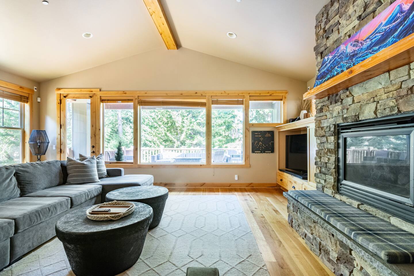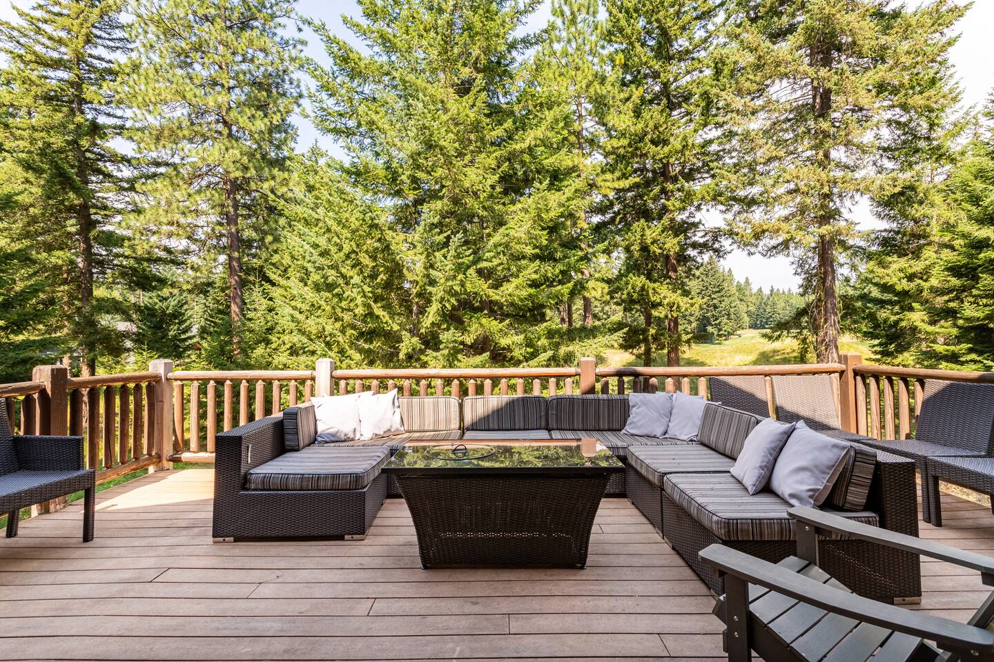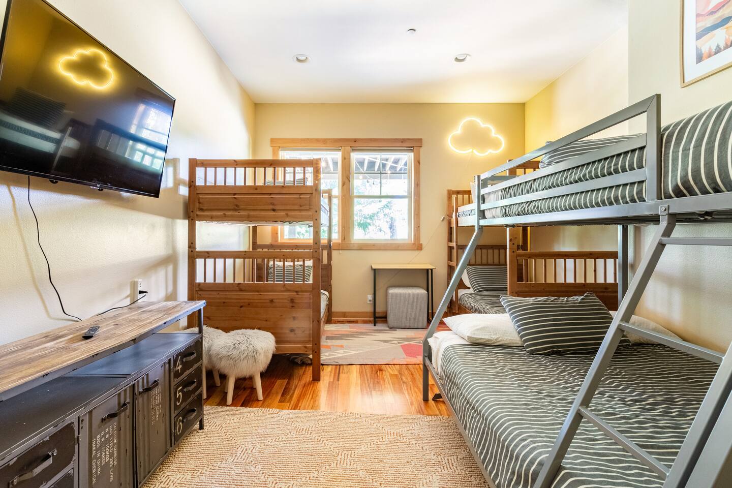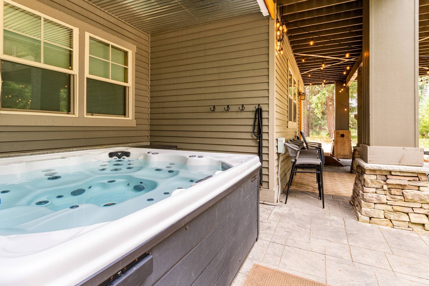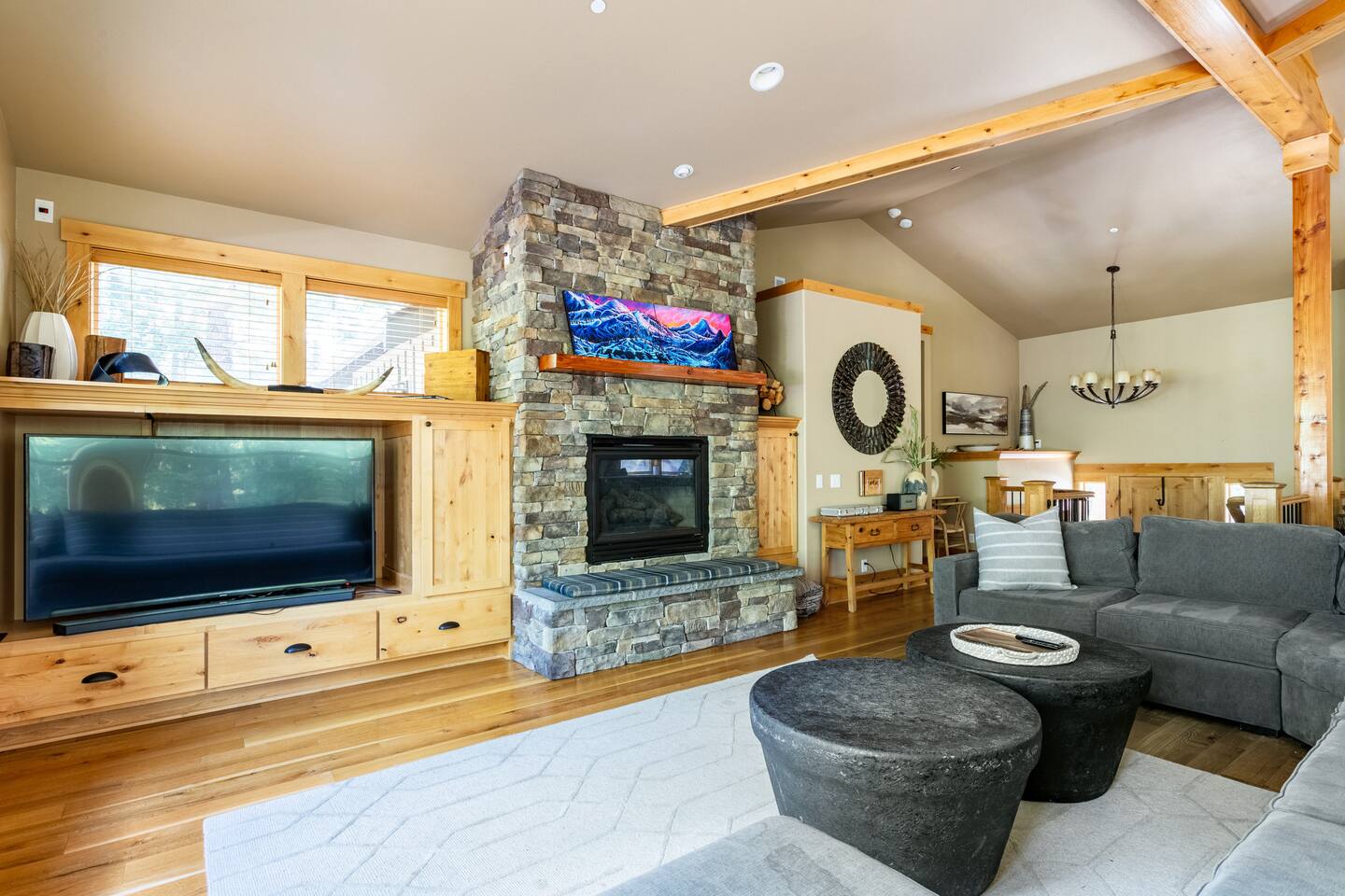 This stunning home offers the comfort, convenience, and privacy of a house with the luxury of a high-end hotel. We have carefully provided luxurious furnishings and amenities to make it one of the most desirable vacation homes at Suncadia! The home offers many amenities, including a full kitchen with professional-grade appliances, a large living room with a beautiful stone fireplace, a large patio and deck, toys and games for the whole family, 6 large HDTV's with DirectTV, apps, and FireTV's, and complimentary 100MB internet. Also we have just recently added a Golf Simulator for year round Golf. It’s all you could want for your next getaway! • Kitchen: the spacious kitchen features all the appliances, cookware, and utensils you need to prepare delicious meals—or you can cook outdoors on our gas barbeque. Enjoy your culinary creations at the spacious 10-seat dining room table, kitchen bar, or even outside on our 8-person patio set and enormous outdoor sectional. This home was built for entertaining! • Activities: there are many ways to spend a fun afternoon or evening around the property, from relaxing in the 8-person hot tub, to enjoying lawn games, to watching your favorite sports in the spacious living room on our 65” 4K curved TV. In the living room curl up with a book beside the stone fireplace, or enjoy the evening with a large group of family and friends. • Bedrooms: each of the 4 bedrooms are fully furnished for your group and uniquely designed with their own themes, and the bathrooms are stocked with complimentary essentials. The master bedroom offers a plush king-size bed, gas fireplace, TV, and ensuite bathroom with rain shower. The lower level features two more bedroom suites with king sized beds, each with televisions and their own private bathrooms—if you’d prefer, one of the beds can be converted to two twins. The 4th bedroom features 6 bunk beds with sleeping for 7.